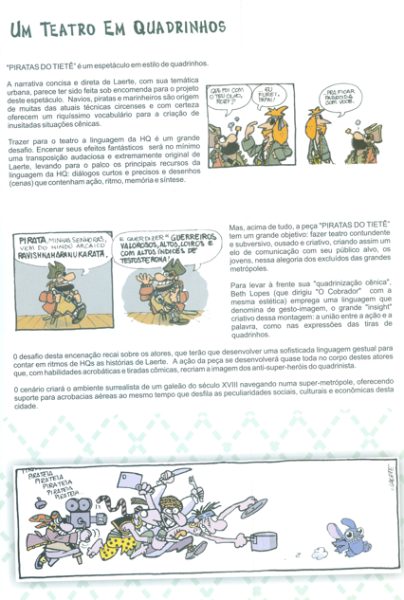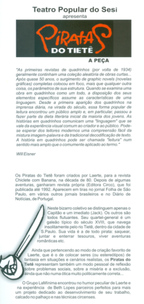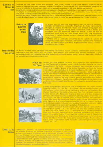A peça Piratas do Tietê mistura sátira política, humor ácido e elementos circenses para criticar a manipulação de verba pública. A trama acompanha piratas que, após escapar de uma execução, se envolvem com Silver Joe e Rosy, que prometem filmar um projeto e oferecer um prêmio Minhocão de Ouro, paródia do Oscar.