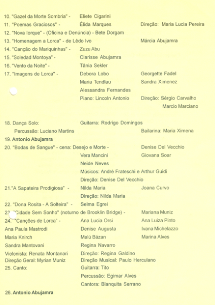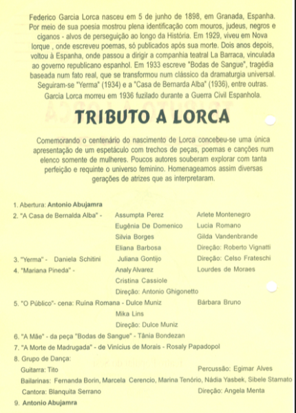 Esta peça é encenada em 1998, com concepção e direção geral de Antônio Abujamra, e propõe uma reflexão sobre a obra e o legado de Lorca, um dos poucos autores que souberam explorar com tanta perfeição e requinte o universo feminino, buscando reviver seu espírito e suas temáticas centrais, como a morte, o amor, a liberdade, a repressão social e a violência.