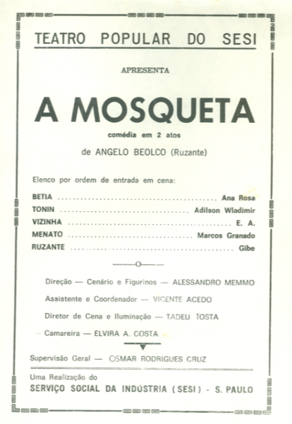 A peça A Mosqueta é uma comédia escrita por Angelo Beolco, conhecido como Ruzzante, com direção de Osmar Rodrigues Cruz e apresentação em 1975. A narrativa gira em torno de uma série de situações cômicas envolvendo amor e rivalidade, especialmente entre casais e amigos, refletindo as fraquezas humanas de forma satírica. Ruzzante utiliza um diálogo ágil e espirituoso, caracterizado por expressões populares e um humor ácido, que traz à tona a hipocrisia social e as complexidades das relações pessoais.