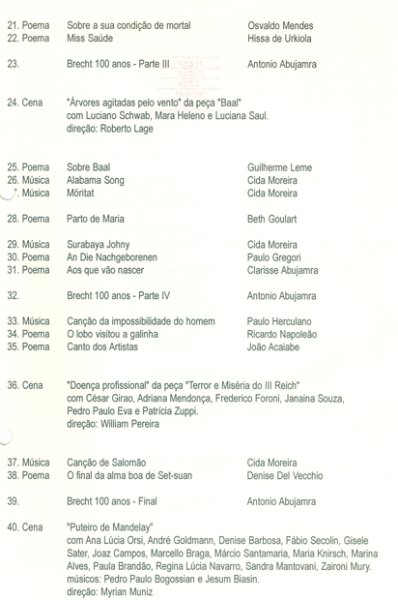 A peça Tributo a Bertolt Brecht, com apresentação em 1998, homenageia o dramaturgo alemão Bertolt Brecht (1898–1956), criador do Teatro Épico. A montagem rompe com a narrativa linear e se constrói como mosaico de textos, canções e fragmentos de obras como A Vida de Galileu, O Círculo de Giz Caucasiano e Mãe Coragem e Seus Filhos. No palco aparecem temas centrais do autor, como alienação, luta de classes, opressão e o papel transformador do teatro, reatualizados para o Brasil dos anos 1990, em contexto de transição política e social.